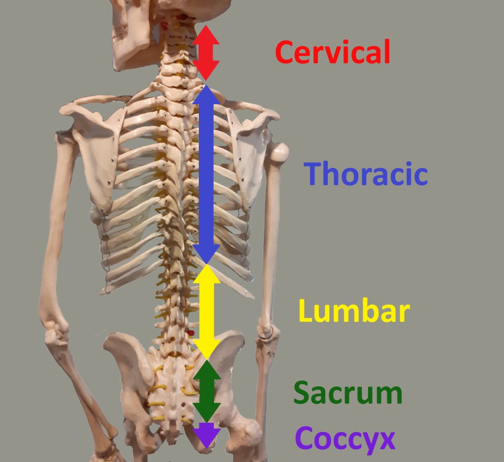 The Five Sections of the Spine: the cervical, thoracic, lumbar, sacrum and coccyx.