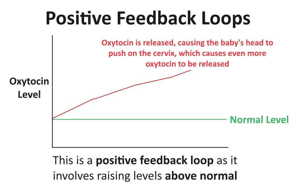 This also illustrates how in positive feedback loops the bodily process continues to cause more of the hormone to be released for as long as necessary: oxytocin is released, which pushes the baby towards the cervix, which stimulates the cervix to release even more oxytocin, a looping process that does not stop until necessary, ie when the baby is born: