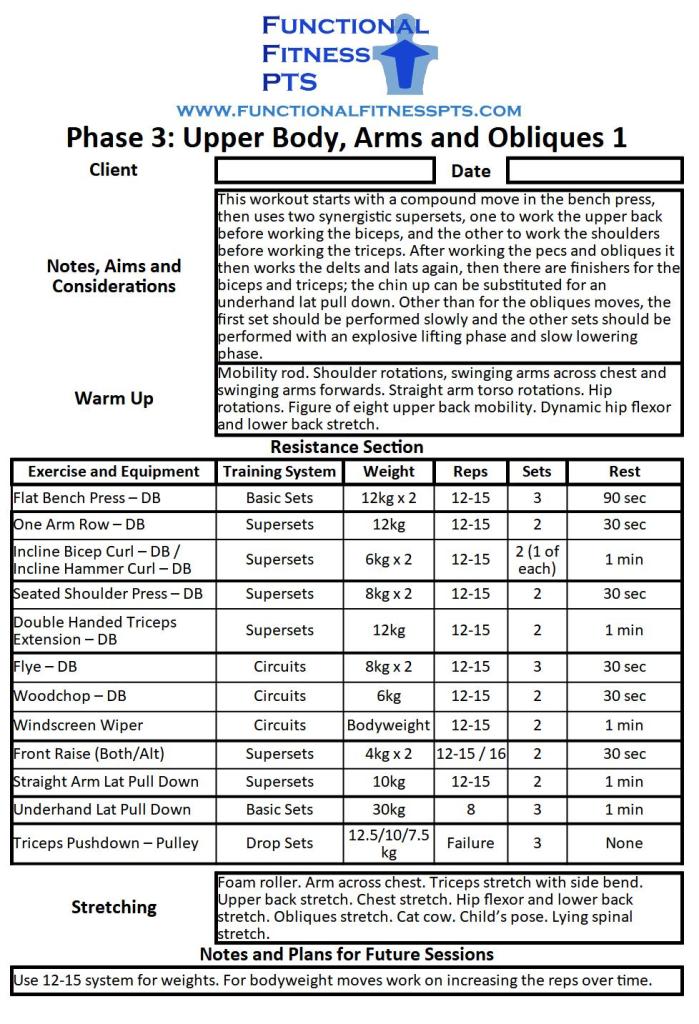 - Phase 1: Here, the main aim is muscular endurance, or getting the muscles used to being under tension for longer periods so as to lay down a foundation upon which to build strength and muscle, along with ensuring the body is moving within its full range of motion. A full-body workout plan is carried out 2-3 times per week, in which all the major muscles are worked, using training systems including circuit training and time under tension.
